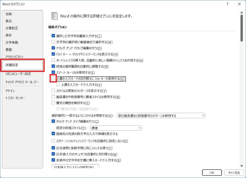 「Wordのオプション」画面が開きますので、「詳細設定」タブの「上書き入力モードの切り替えに Ins キーを使用する」のチェックを外して右下の「OK」をクリックしてください。